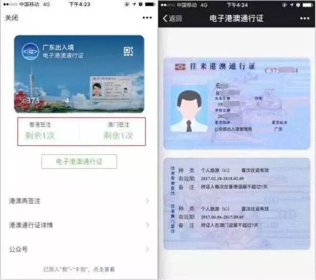 除了“微信使用小助手”外,为节省用户时间成本,也为中老年用户身体条件着想,“广东出入境”微信服务号推出新功能,用户可绑定电子港澳通行证,还能直接在微信卡包中查看签注次数,并实现轻松续签等功能,微信再次推进用户智慧生活。中老年人可在家把通行证放进微信卡包,随时能和老伙伴们来一次说走就走的旅行。