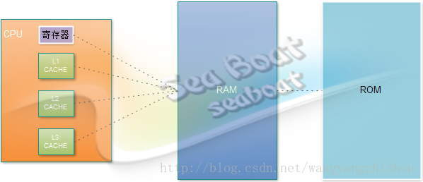 在讨论之前必须先搞清四种存储介质:寄存器、高级缓存、RAM和ROM。