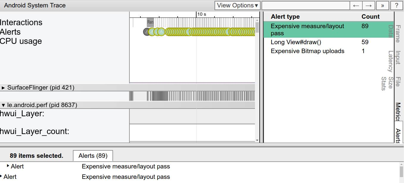 Systrace 会自动突出显示此布局中的(大量)性能问题,并给出修复这些问题的建议。通过点击“Alerts”标签,您会发现,绘制此视图层次结构需要反复执行 80 次的测量和布局阶段,开销极为庞大!触发开销如此庞大的测量和布局阶段当然很不理想,如此庞大的绘制 Activity 会导致用户能够觉察到丢帧的现象。我们可以得出这样的结论:这种嵌套式层次结构和 RelativeLayout(会对其每个子对象重复测量两次)的特性导致性能低下。