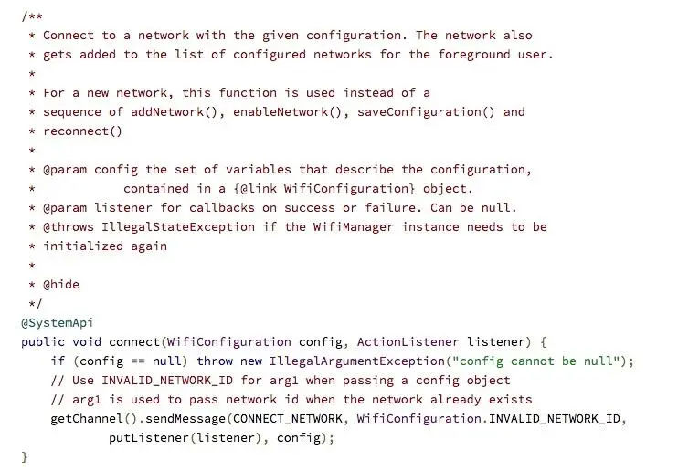 对不起,我骗了大家。我是一个大骗纸。其实这个api不是小米私有的,是系统隐藏API。只是说常规的切换方式在小米上无效。正好小米的 Settings内部用的是connect方法系统隐藏Api。我们来看一眼 WifiManager官方源码。