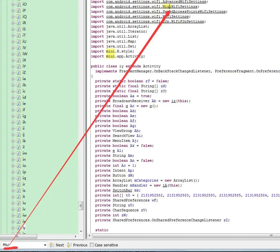 Activity直接展示的而用了fragment我们搜索一下MiuiWifiSettings。果然存在这里。