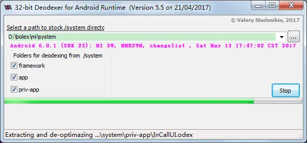 我们打开SVADeodexerForArt自动合并框架工具。 选择我们解压好的目录至system下。依次全部勾选下面三个选项,点击Execute后就会出现下面这幅图的样子,只需要静静等待几分钟就可以了。他会将odex资源与apk进行合并。