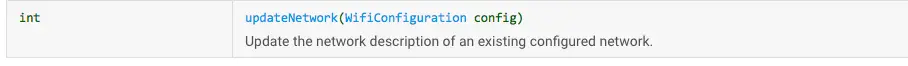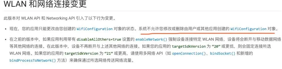 注意:我翻译下,官方的意思是说由用户手动创建和其他app创建的WifiConfiguration配置信息是不能被我们修改的。明白了吗?和切换没有什么关系。因为我们不修改,只是连接切换操作。