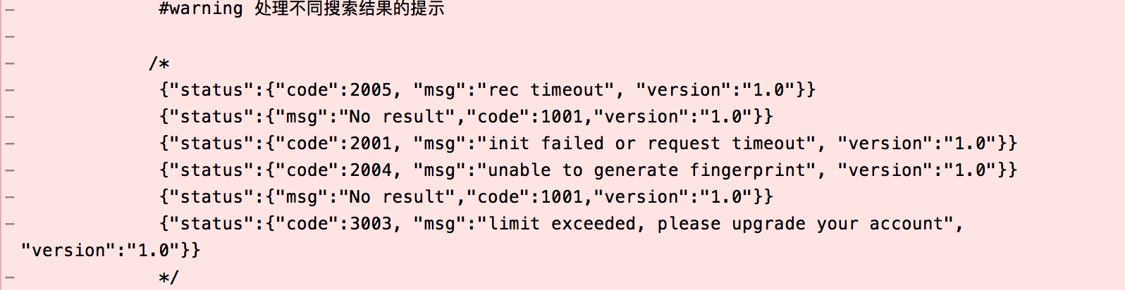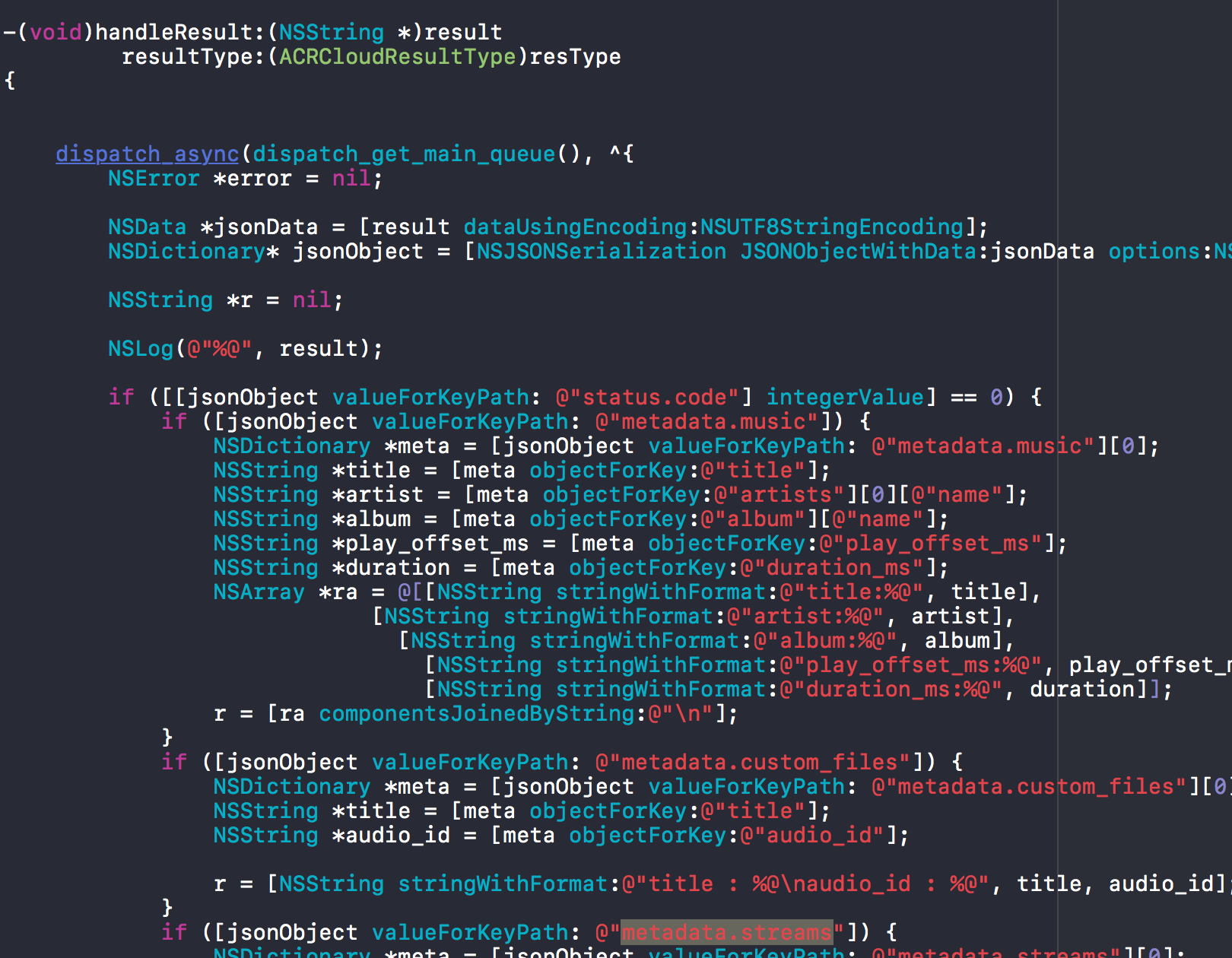 我们可以自己定义模型去接收,里面有返回最有效果的信息,如果有资源版权做App内歌曲播放器,可以用到识别的时候的播放未知,其他数据也很有用