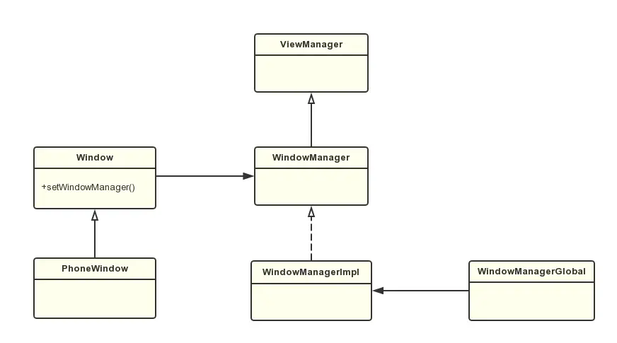 PhoneWindow继承自Window,Window通过setWindowManager方法与WindowManager发生关联。WindowManager继承自接口ViewManager,WindowManagerImpl是WindowManager接口的实现类,但是具体的功能都会委托给WindowManagerGlobal来实现。