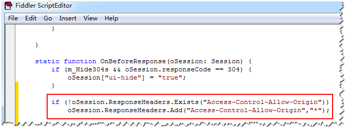 搞清楚 CORS 原理之后会发现这个问题不难解决,没有插件我们可以使用抓包工具来给 response 加上 “Allow-Control-Allow-Origin: *”,比如 fiddler。在 fiddler 菜单中找到 Rules → Customize Rules…,弹出 fiddler 脚本编辑器(第一次按提示安装即可),如下图所示,在 OnBeforeResponse 函数中加上红框中的代码,保存成功之后,fiddler 便会自动给经过它的 response 增加 “Allow-Control-Allow-Origin: *” 了,我们只需要设置好浏览器和手机的代理,让请求和响应经过 fiddler 即可实现跨域。