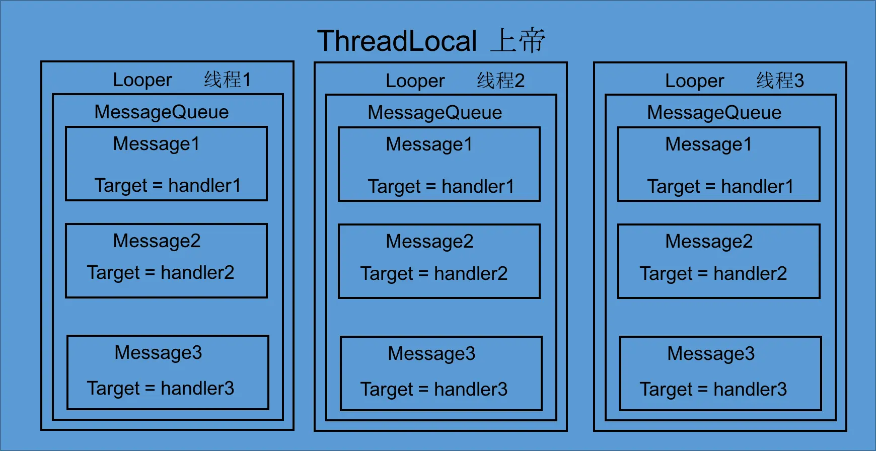 通过上帝 ThreadLocal,并根据当前线程,可获取 looper,进而获取 MessageQueue,Callback之类的。
