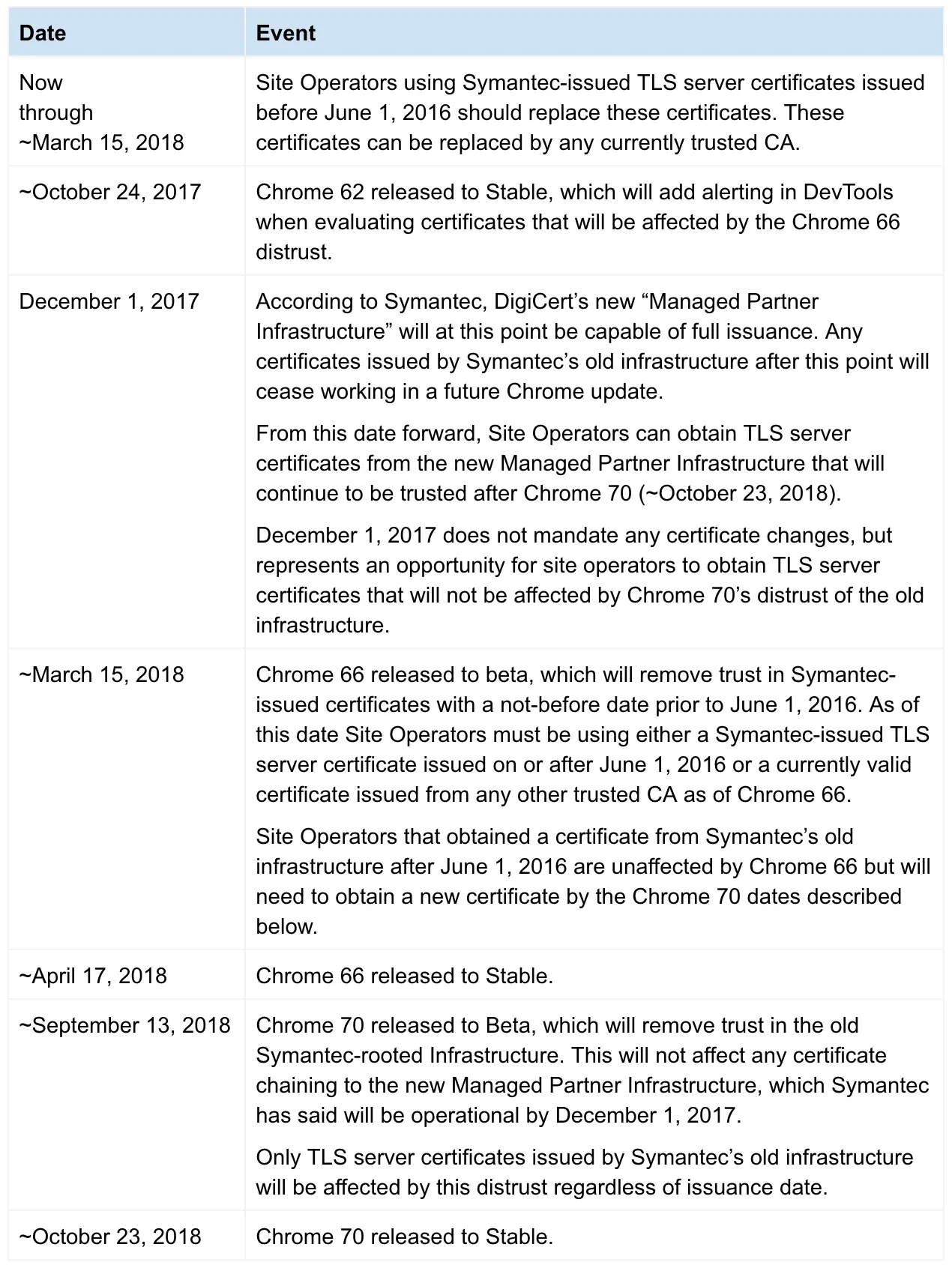 2017 年 10 月发布的 Chrome 62 将在 DevTools 中加入对即将不受信任的赛门铁克证书的警告;2017 年 12 月 1 日,DigiCert 将接手赛门铁克的证书签发业务;2018 年 4 月 17 日发布的 Chrome 66 将不信任 2016 年 6 月 1 日之前签发的证书;2018 年 10 月 23 日发布的 Chrome 70 将停止信任赛门铁克的旧证书。受影响的赛门铁克 CA 品牌包括 Thawte、VeriSign、Equifax、GeoTrust 和 RapidSSL,几个独立运作密钥不受赛门铁克控制的次级 CA 得到了豁免,其中包括了苹果和 Google。Google 建议使用赛门铁克证书的网站及时更新到受信任证书。