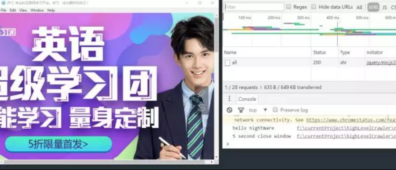 这个脚本会在打开的浏览器的调试控制台中打印出 hello nightmare 并且在5秒后关闭,随后在运行的该脚本的中输出 close nightmare。