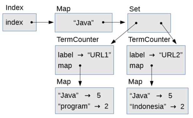 每个TermCounter包含label,它是页面的 URL,以及map,它是Map,包含页面上的单词和每个单词出现的次数。