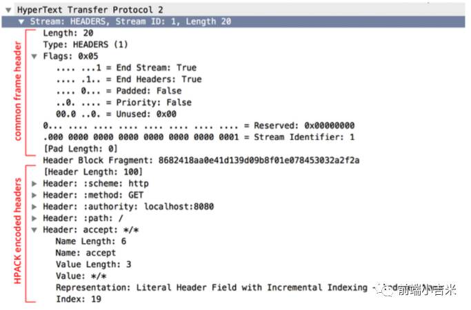请仔细查看他的 Type 可以发现,就是一个 HEADERS。 这也就是上面所说的存储两个不同的 header table -- static table && dynamic table.
