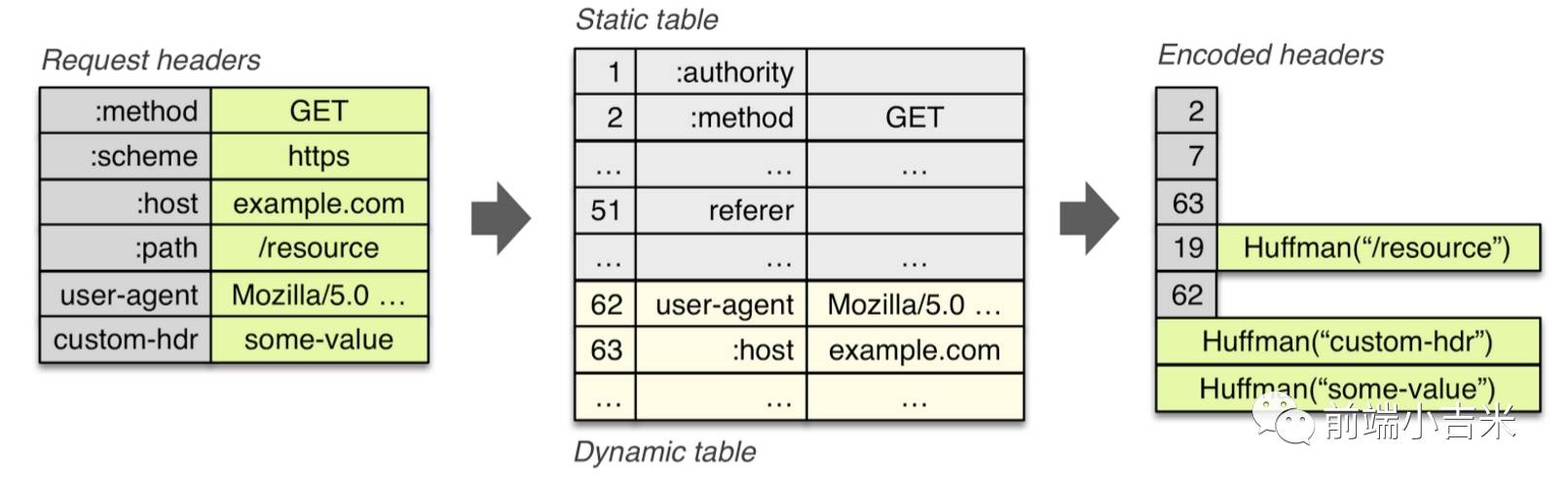 HEADER的优化,主要还是由于HTTP1.1的头部机制--在每次请求时,都需要将一大堆头部带上,甚至带上cookie这灰常大的内容. 所以,SPDY 觉得这样不行,然后就是用了GZIP的压缩方式,但这样很容易的就被破解并且劫持,导致安全性问题. HTTP2吸取了这次教训,决定自己开发一套优化方案,即,因为头部的更替不是很频繁,那我就在Server端做个缓存呗,在你这次连接有效的时间里面, client就用重复的发送请求头了. 这就是HTTP2的HPACK压缩方式. HPACK压缩会经过两步: