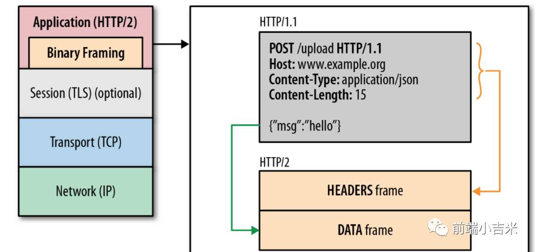 说道H2的二进制,首先得介绍一下H1的超文本协议.HTTP1.1每次在发送请求时,都需要找出 开头和结尾的每一帧的位置, 并且,在写入的时候,还需要删除多余的空格,以及选择最优的方式写入, 并且如果是HTTP+TLS的话,那性能损耗就比较呵呵了,因为TLS本身的握手协议,以及加密的方式,在一定程度上会对文本信息的内容进行处理等等. 这些无疑都给HTTP1.1的速度造成了极大的影响.所以,HTTP2 不采用这种方式来,而,干脆直接使用二进制. 那,H2是怎样实现,二进制传输呢? 这里,借Grigorik在velocity 会议上的PPT,来看一看.