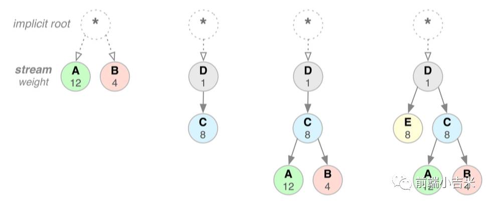 我们就按照上图的情况来说明吧. 如果一个C资源依赖于D资源,那么D则作为C的父节点. 然后按照这样的顺序继续排下去.如果存在在一个根节点下面存在两个节点,比如第一个A,B。 那应该怎么分呢? 这时候,就用到上文提到的priority. 主要A和B上面的数字. A-12,B-4. 将网络资源--实际上就是带宽和CPU,化成一块蛋糕,那么,在此时,A可以分到3/4的资源,而B只能分到1/4的资源. 分配 ( allocation ) 好了之后,则便返回数据.( Ps: 在HTTP2中,分数不分数这并不重要,因为HTTP2传的是二进制,所以,资源不完整是肯定的.只是说,那些文件传的快一些.)我们这里就按照第三个图来进行解释一下吧: