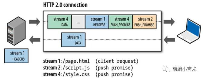 这里,我们之请求了 page.html ,但实际上通过 push promise. server 自动 push 给我们了 script.js 和 style.css 两个文件. 这样就省去的两个 request 的开销.这种方式,也就是我们经常看到的 inlining css 和 inlining script. 不过, 使用 HTTP2 这种机制的话,有一下几个优于 inlining 的特点: