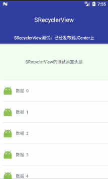 recyclerView.setLoadListener(new SRecyclerView.LoadListener() { @Override public void refresh() { new Handler().postDelayed(new Runnable() { @Override public void run() { refreshData(); recyclerView.refreshComplete(); } }, 2000); } @Override public void loading() { new Handler().postDelayed(new Runnable() { @Override public void run() { if (list.size() != 30) { loadData(); recyclerView.loadingComplete(); } else { recyclerView.loadNoMoreData(); } } }, 2000); } }); //item的点击事件 recyclerView.setItemClickListener(new SRecyclerView.ItemClickListener() { @Override public void click(View v, int position) { Toast.makeText(getApplication(), "位置: " + position, Toast.LENGTH_SHORT).show(); } }); //可以设置一个EmptyView recyclerView.setEmptyView(emptyView); //可以手动设置一个刷新头部,应该在setAdapter方法之前调用,适用于某个列表需要特殊刷新头的场景 //SRecyclerView的头部设置有两种种方法:代码设置,全局配置。如果两种方法都没有设置,则适用默认自带的默认刷新头和加载尾 //recyclerView.setRefreshHeader(new TestRefreshHeader(this)); //recyclerView.setLoadingFooter(new TestLoadFooter(this)); //这里的适配器使用的一个简易的SRV适配器,同样也可以用于普通的RecyclerView,当然这里也可以用原生的适配器 recyclerView.setAdapter(new SRVAdapter(list)); //recyclerView.setAdapter(new InitAdapter(list, this)); //测试添加头部 View header = LayoutInflater.from(this).inflate(R.layout.header_test, recyclerView, false); recyclerView.addHeader(header); //测试添加尾部 View footer = LayoutInflater.from(this).inflate(R.layout.footer_test, recyclerView, false); recyclerView.addFooter(footer); //SRV的代码刷新,应该在setAdapter方法之后调用,true表示会有刷新动画,false无任何动画 //recyclerView.startRefresh(true);自带的用户简化代码的适配器使用栗子如下,可以看到相比于原生的适配器写法,能减少不少代码,当然这个适配器也可以用于其它的RecyclerView