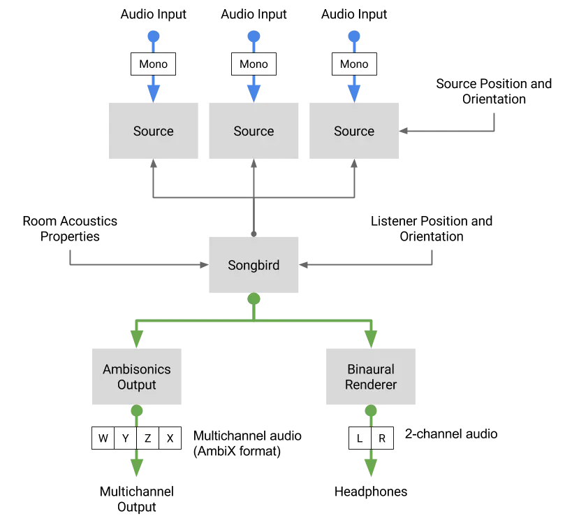 Songbird 基于 Google 空间媒体规范实现。它接受单声道输入并通过 SN3D 归一化输出环绕声(多声道)ACN 声道布局。详细文档可在此处找到。