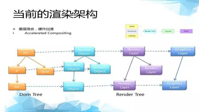 内核会通过硬件加速和图层混合来减少渲染的节点或任务。图层混合就是把一些相关的元素放在同一层,非相关的元素放在另外的层去汇总。