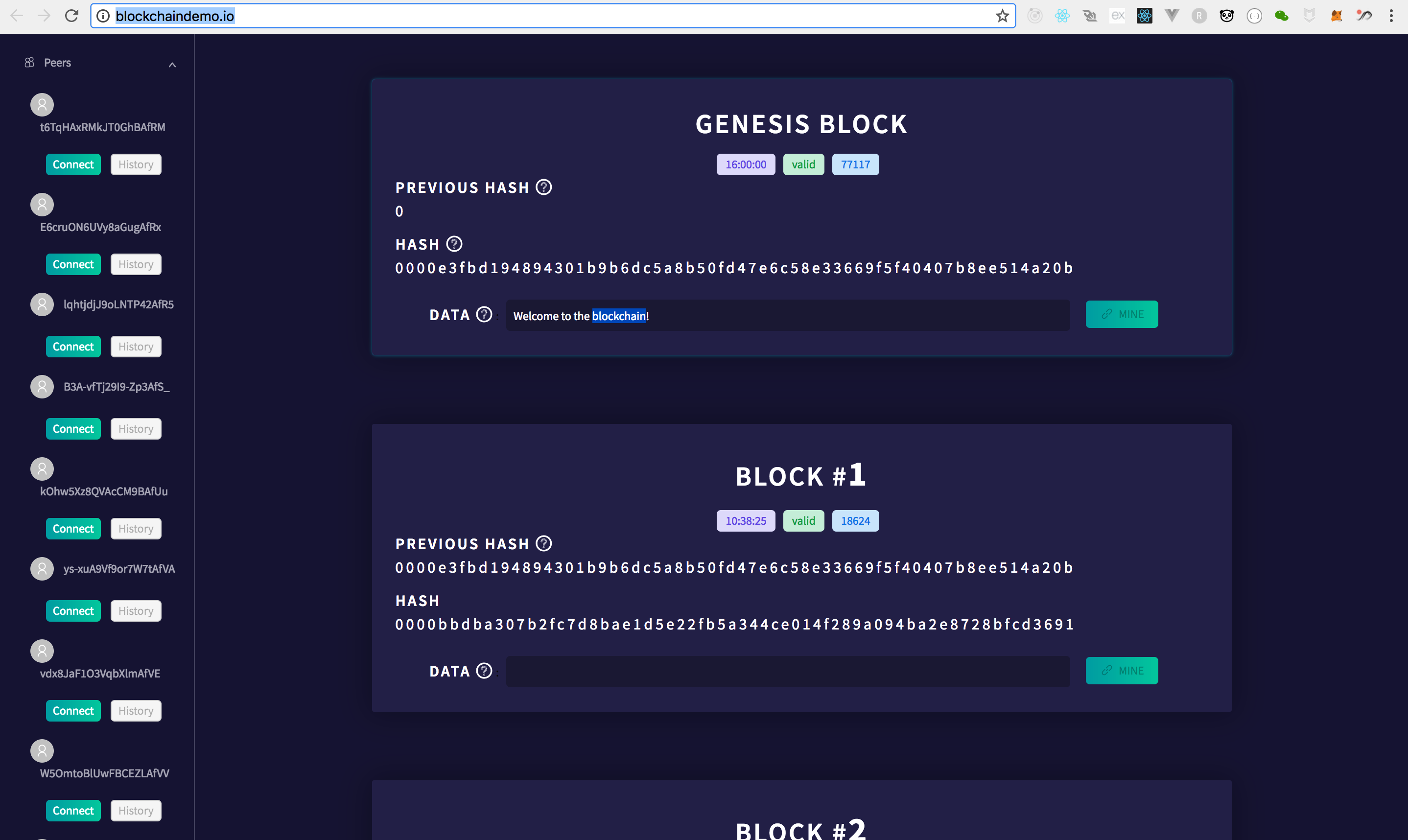 Index (Block #):第几个区块? (创世区块链的索引为0)Hash:当前区块的hash值Previous Hash:上一个区块的hash值Timestamp:当前区块创建时的时间戳Data:存储在当前区块上的交易信息Nonce:在找到有效区块之前,我们经历的迭代次数