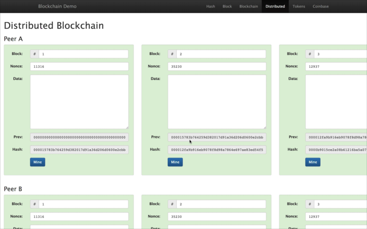 在这个demo的演示中,一共有三个节点,我修改了节点2的区块链5并且重新挖矿取得合法的hash值,但是因为节点A和节点C中区块5的hash值为0000e4b9052fd8aae92a8afda42e2ea0f17972ea67cead67352e74dd6f7d217c,而节点B中的hash值为0000184634edadb8fc7f4bdee87aa9d7d2a46b0c26db221998e35c1f57c0b42c,少数服从多数,所以以节点A和C的区块数据为准。