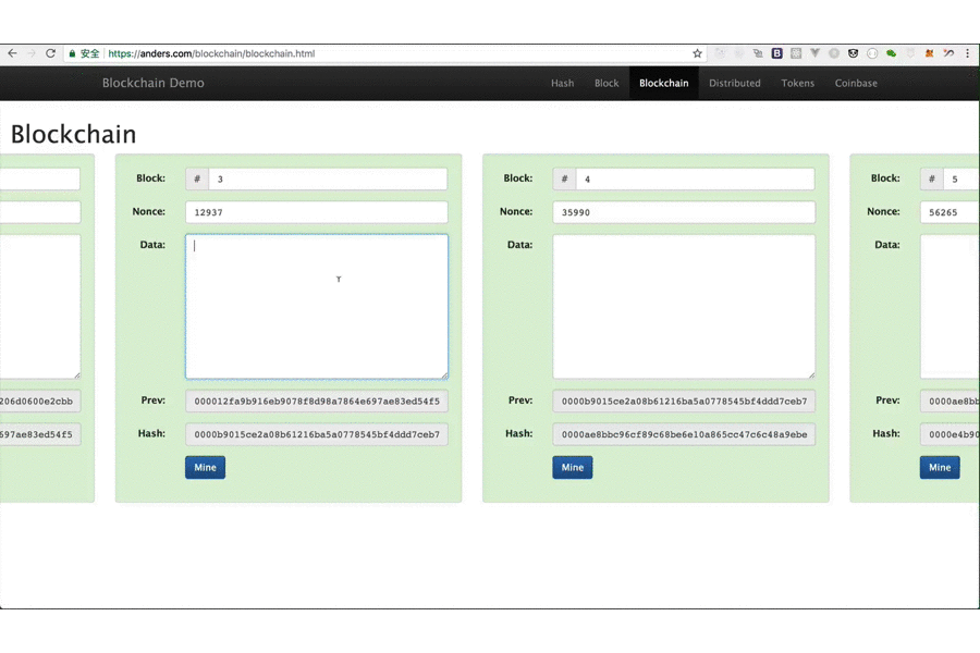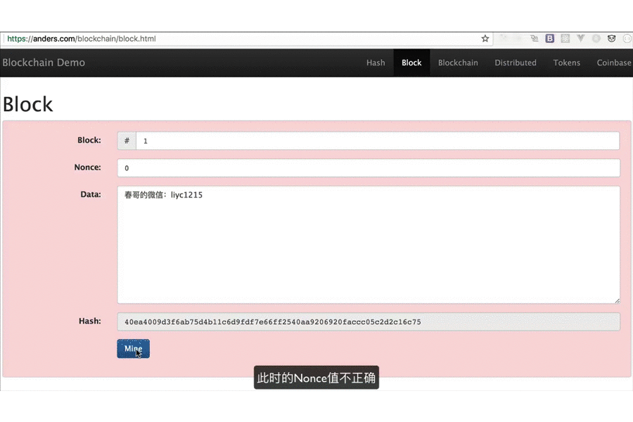 nonce值一直迭代,直到hash值有效为止。在我们案例中一个有效的hash值是最少有4个前导0。找到nonce值以满足合适条件的hash值的过程就叫做挖矿。