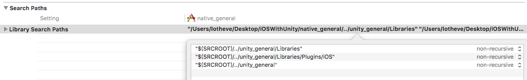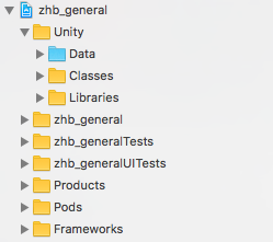 在目标iOS工程里引用unity iOS工程中的文件,主要就是三个目录,Classes,Libraries,Data。这里需要注意的是,Classes和Libraries目录作为Group引用,切记不要勾选copy,而Data目录不需要参与编译,作为folder引用进来即可。本例中统一引用到Unity group下,文件结构如下: