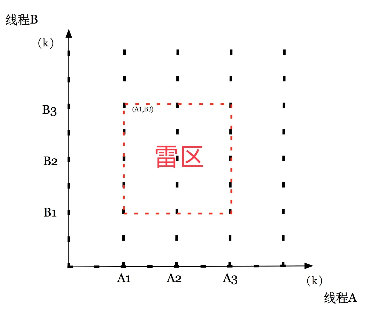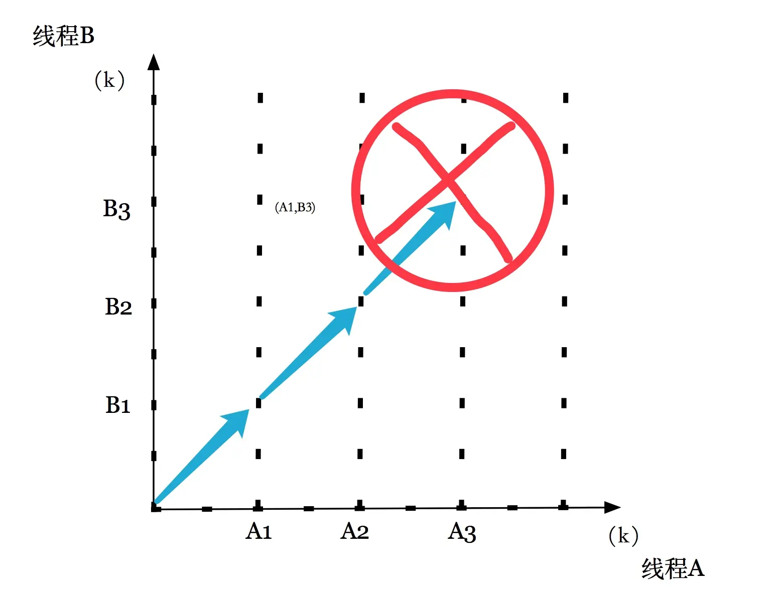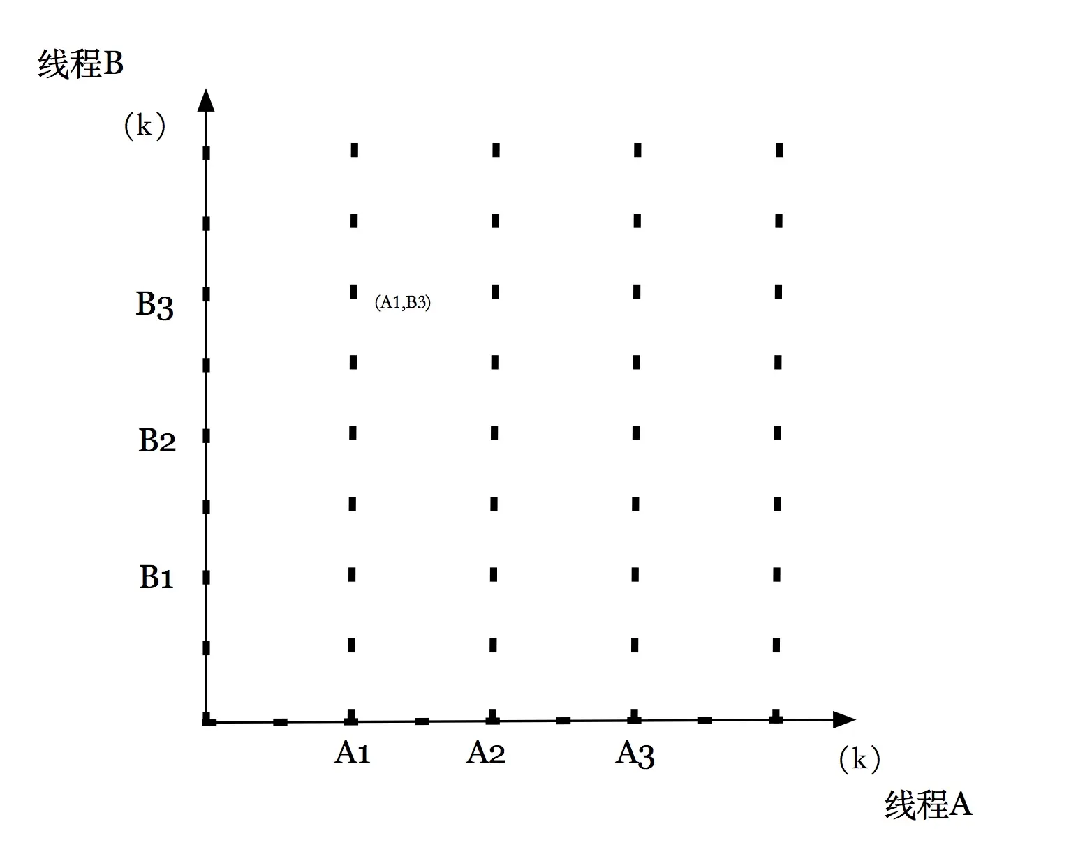 每条轴的 k 对应线程 k 的进度。每个点代表线程 k已经完成了指令 I_k的状态。