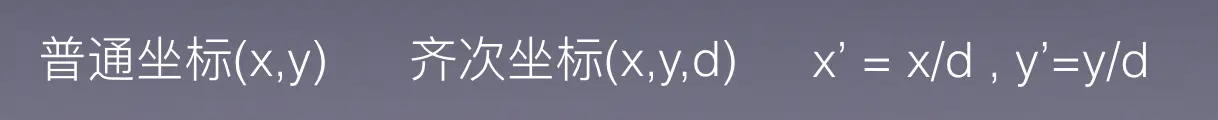 第三列参数,直接作用到齐次坐标的n+1维的参数上,它同普通坐标的转换关系以我们一直讨论的二维为例,如下图。为保证x = x',y = y',所以默认转换后,齐次坐标的d = 1,如果第三列前两个参数均为0,那么修改右下位置的参数,可以直接控制图形的缩放。前两个参数则是随着图形中点的x、y值的变化改变对于齐次坐标中d值得影响。