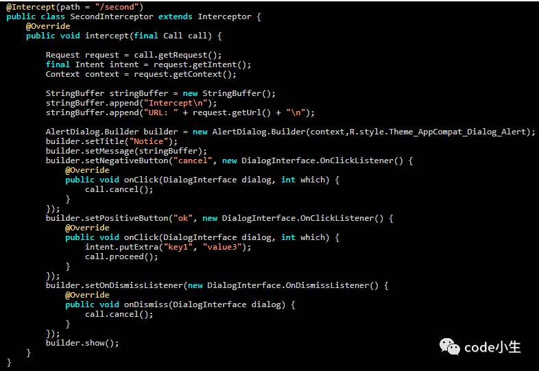 DispatchActivity再把Intent转发到Service,再finish,这种方法唯一的缺陷是拦截器里面的context是Servcie的activity,就没发再拦截器里面弹出对话框了。 -