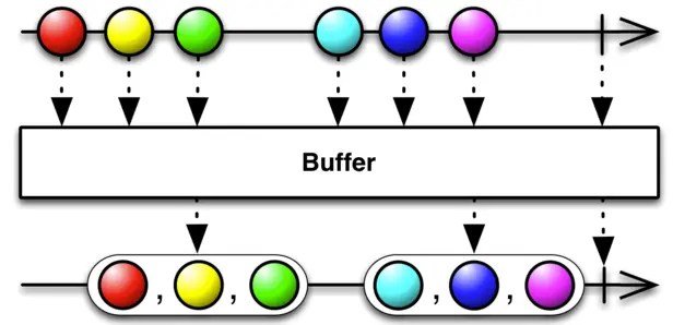 buffer 操作符接受两个参数,buffer(count,skip),作用是将 Observable 中的数据按 skip (步长) 分成最大不超过 count 的 buffer ,然后生成一个 Observable 。也许你还不太理解,我们可以通过我们的示例图和示例代码来进一步深化它。