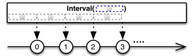 如同我们上面可说,interval 操作符用于间隔时间执行某个操作,其接受三个参数,分别是第一次发送延迟,间隔时间,时间单位。