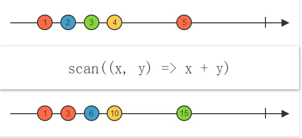 scan 操作符作用和上面的 reduce 一致,唯一区别是 reduce 是个只追求结果的坏人,而 scan 会始终如一地把每一个步骤都输出。