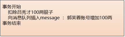 InputReader 说: “小人举的是个非常简单的例子, 但是也能说明问题了, 你看我们想从吕秀才账户转100两银子给郭芙蓉, 需要在数据库1发起一个事务, 从吕秀才账户扣除100两, 然后还得向消息队列插入一条给郭芙蓉账号增加100两的消息, 然后这个数据库1的事务就结束了! 消息队列中的消息会在某一刻被读取出来,进行处理,给郭芙蓉的账号增加100两。”