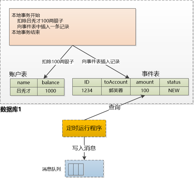 “在这里,我们可以添加一个‘事件表’, 转账开始的时候,把吕秀才的100两银子扣除, 同时还向事件表插入一行记录: 需要向郭芙蓉转100两, 由于这两个表是在同一个数据库中,所以直接使用本地事务就行。不用什么分布式事务。”