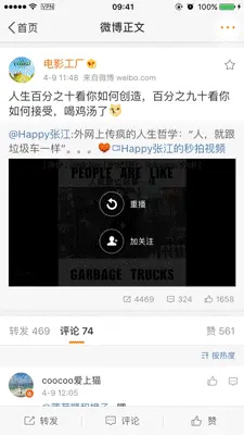 在一个界面内的交互动效特别多,例如点击加号出现下拉菜单,出现浮层动画提示,点击舵式导航出现选择类型和遮罩,点击按钮出现评论点赞,当前页面的展开收起,加载等等。如下图所示: