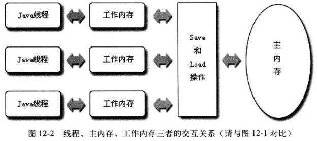 Java内存模型规定了所有的变量都存储在主内存(Main Memory)中。每条线程还有自己的工作内存(Working Memory),线程的工作内存中保存了被该线程使用到的变量的主内存副本拷贝,线程对变量的所有操作(读取,赋值等)都必须是工作内存中进行,而不能直接读写主内存中的变量。线程之间无法直接访问对方工作内存中的变量,线程间变量值的传递均需要通过主内存来完成。交互关系如下图: