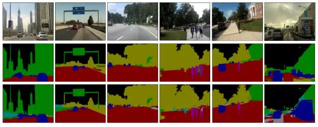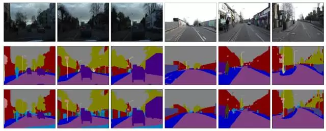 图 6. 我们的方法在 CamVid 数据集上的结果。每一列从上到下依次是:(1)输入图像(2)语义分割结果(3)真值。