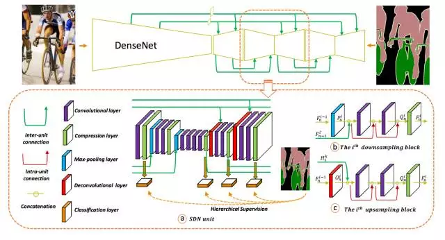 图 1. 我们方法的架构。上半部分表示我们提出的堆叠解卷积网络(SDN)的结构,下半部分表示 SDN 单元(a)、下采样模块(b)和上采样模块(c)的具体结构。