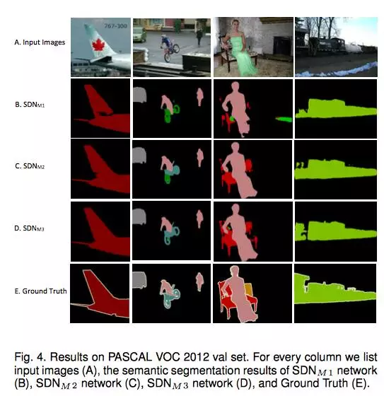 图 4. 我们的方法在 PASCAL VOC 2012 验证集上的结果。每一列列出了输入图像(A)、SDN_M1 网络的语义分割结果(B)、SDN_M2 网络的语义分割结果(C)、SDN_M3 网络的语义分割结果(D)和真值(E/Groundtruth)。