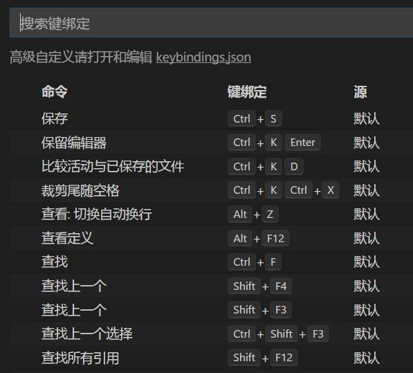 File -> Preferences -> Keyboard Shortcuts中的链接,可以打开keybindings.json文件,定义自己的快捷键