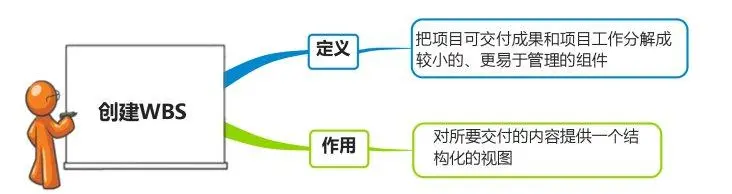 从上图可以看出,通过WBS工作分解,可以得出项目预算、进度计划、人力规划、时间估算等信息。