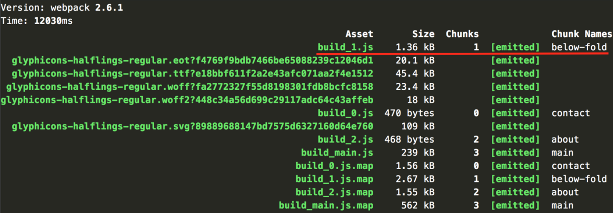 ];看看我们编译代码时的统计数据,每个页面都在它们自己的文件里,但要注意到有个重要的bundle文件叫 build_main.js,它包含了所有的公共代码以及异步加载其他文件的逻辑。无论用户访问哪个路由,都必须先加载它。