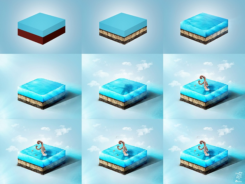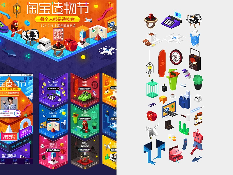 活动专题设计,特别是这类2.5D设计,常用设计方法,就是把已设计好的素材元素在控件排版整合而成。
