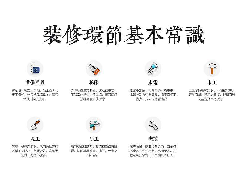 「装修一套房子至少需要选购28种辅材,了解35项基础工艺,购买8种主材,选购65件家具和配饰,要去最少80家店铺和近100个商人PK,买至少200种商品,需要用100天,消耗掉2亿脑细胞才可能完成。」不可否认的是装修是一项系统而繁琐的工程,但是,再复杂的过程,只要化繁为简逐个解决,自然水到渠成。由于完整装修环节相关知识量庞大,而篇幅有限,这里就不详细一一列举,大概整理一些关键又常用的装修相关的知识。