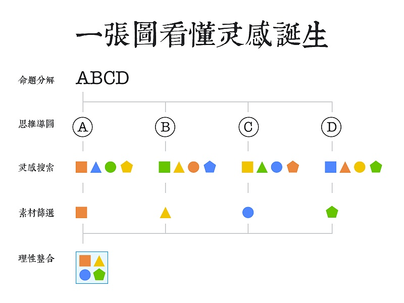 理性的灵感,就是设计方法论。许多时候灵感「挤」不出来,是因为了解的不够。这牵涉到「问题」,找「问题」比找答案重要的原因就在于此,所以找灵感的时候,通常是不断的在问「为什么」,然后去收集相关数据,化繁为简,灵感自然就会出现。