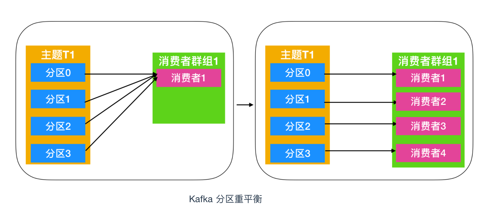 我们从上面的消费者演变图中可以知道这么一个过程:最初是一个消费者订阅一个主题并消费其全部分区的消息,后来有一个消费者加入群组,随后又有更多的消费者加入群组,而新加入的消费者实例分摊了最初消费者的部分消息,这种把分区的所有权通过一个消费者转到其他消费者的行为称为重平衡,英文名也叫做 Rebalance 。如下图所示