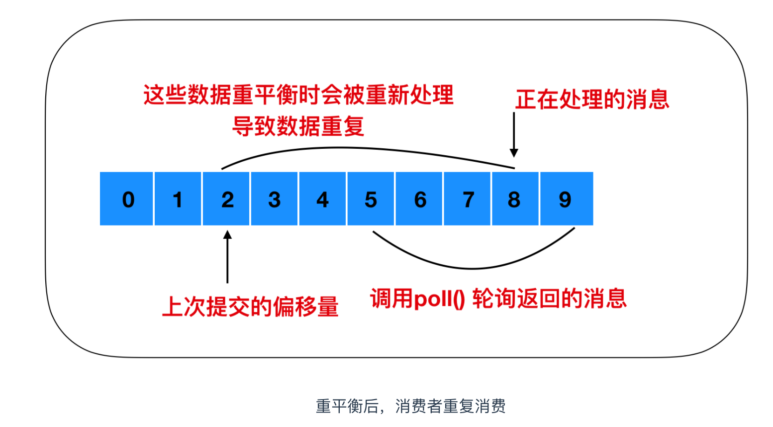 如果提交的偏移量小于客户端最后一次处理的偏移量,那么位于两个偏移量之间的消息就会被重复处理
