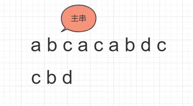如图我们需要在字符串 abcacabdc 中查找是否存在 cbd 这个字符串,那么 abcacabdc 就叫做称作主串,cbd 就是模式串