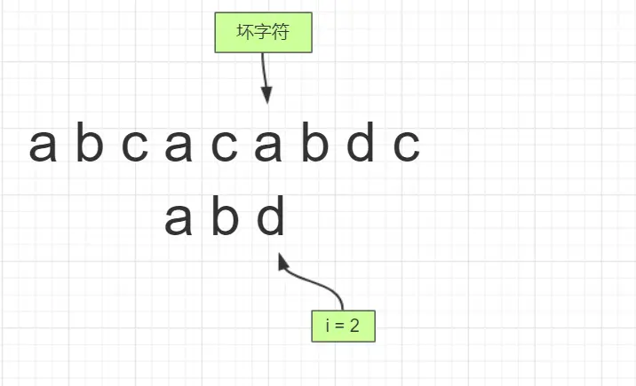 此时我们将坏字符对应模式串的字符的位置,记作 i,那么此时 i = 2