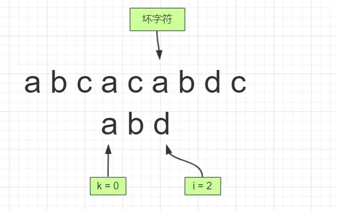 此时模式串需要向后移动 i - k 位 2 - 0 = 2 位,匹配成功